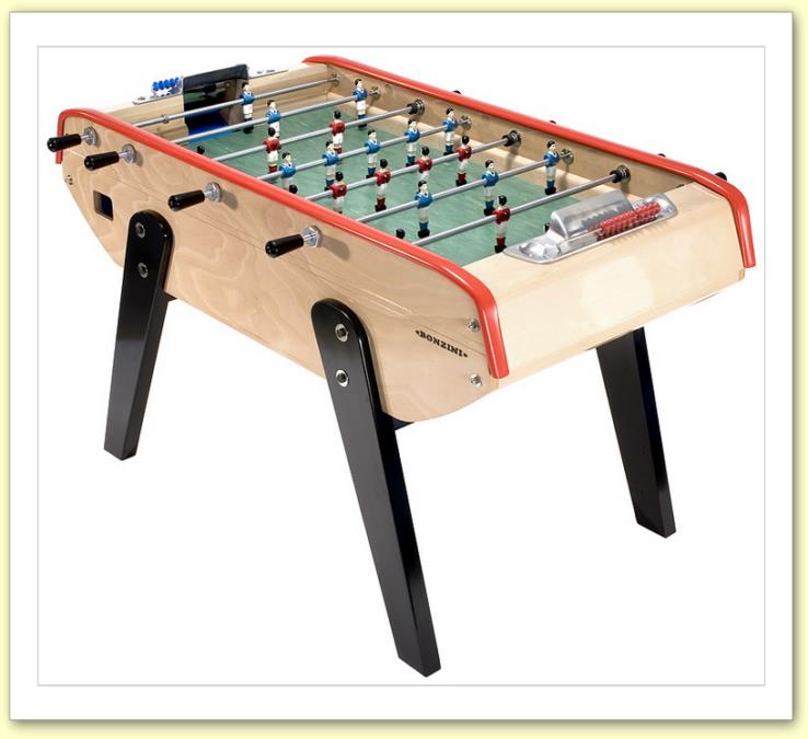 Baby foot Bonzini. Longueur : 150 cm. Largeur : 80 cm. Interieur du terrain : 122*72 cm. Hauteur : 90 cm. Poids : 80 Kg. Matériau identique au modèle de café, sans le monnayeur. Façades du meuble en multiplis tout hêtre 1er choix, épaisseur 22 mm. Côtés latéraux en hêtre massif 1er choix. Assemblage de menuiseries doublé par des éléments mécaniques. Barres : télescopiques, acier rectifié chromé dur, interchangeables. Tapis Gerflex. Joueurs vissés en aluminium. Coussinets en polyamide très résistant à l'usure. Buts en aluminium. Livré avec 6 balles. Poignées rondes, longues ou longues américaines au choix |