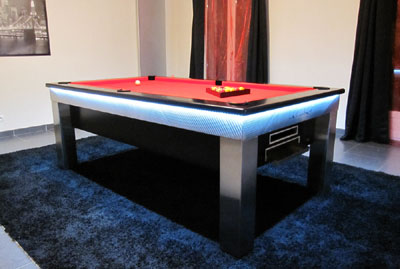 100% personnalisable : teinte du billard au choix (finition mat, brillant ou bois). Libre à vous de choisir la finition de votre billard. Plusieurs options possibles: stickers sur les flancs (modèle à souhait), diodes sur secteur ou batteries, poches cuir (coloris au choix: marron, noir, bordeaux, crème, blanc), monnayeur mécanique ou électronique.