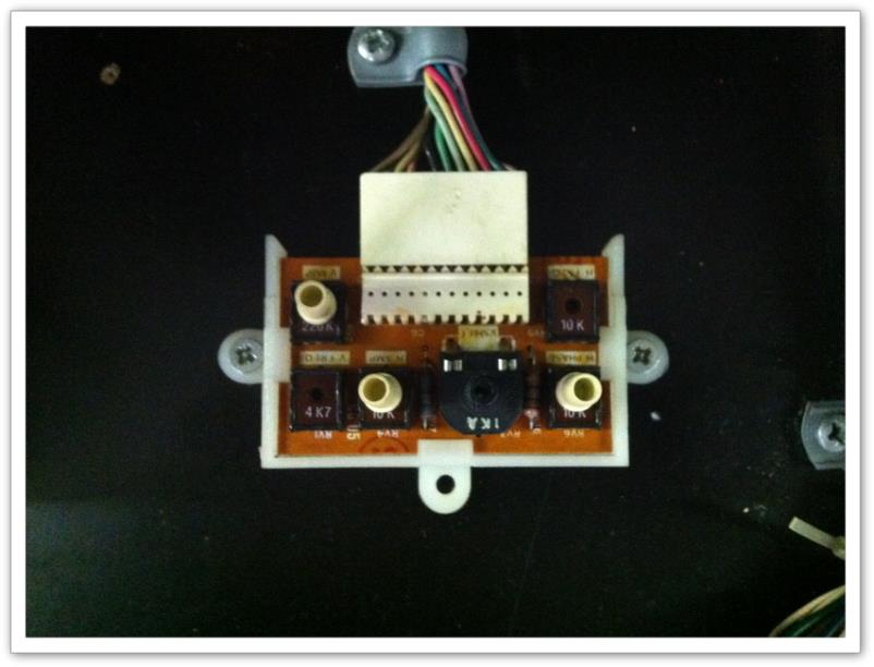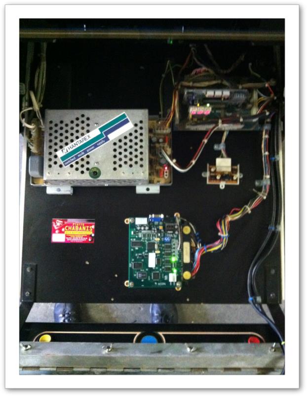 Alimentation, carte JAMMA, et réglage écran montés sur un tiroir.