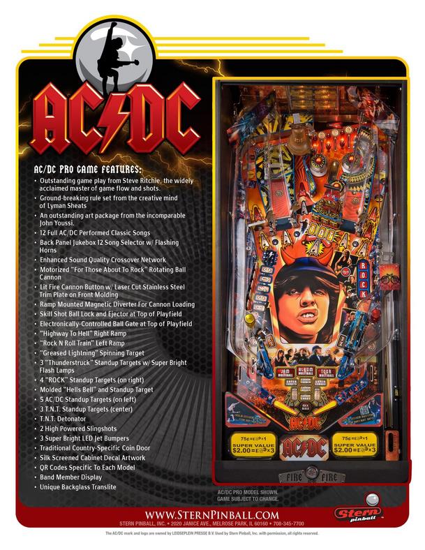 Caractéristiques modèle pro : • 1 rampe avec dérivation magnétique pour le chargement Cannon • Autocollant de caisse et décal en qualité haute résolution. • Contrôle par le joueur du canon motorisé pour l'éjection de la balle. • 3 cibles "Thunderstruck" avec lampes flash. • 4 cibles fixes "ROCK" (à droite) • Départ du canon par un bouton lumineux sur une plaque métallique découpé au laser. • Panneau au fond du plateau style Jukebox, et sélection des chansons. • 2 rampes plastiques "Super Speed" • Caisse avec poignée TNT Explosion au milieu du plateau • 3 Bumpers avec LED • Monnayeur €uro • Haut-parleur dd caisse 8 pouces pour une meilleure qualité sonore • Détonateur fixe TNT • 5 cible fixes AC / DC (à gauche) • 3 Cibles fixes TNT (au centre)